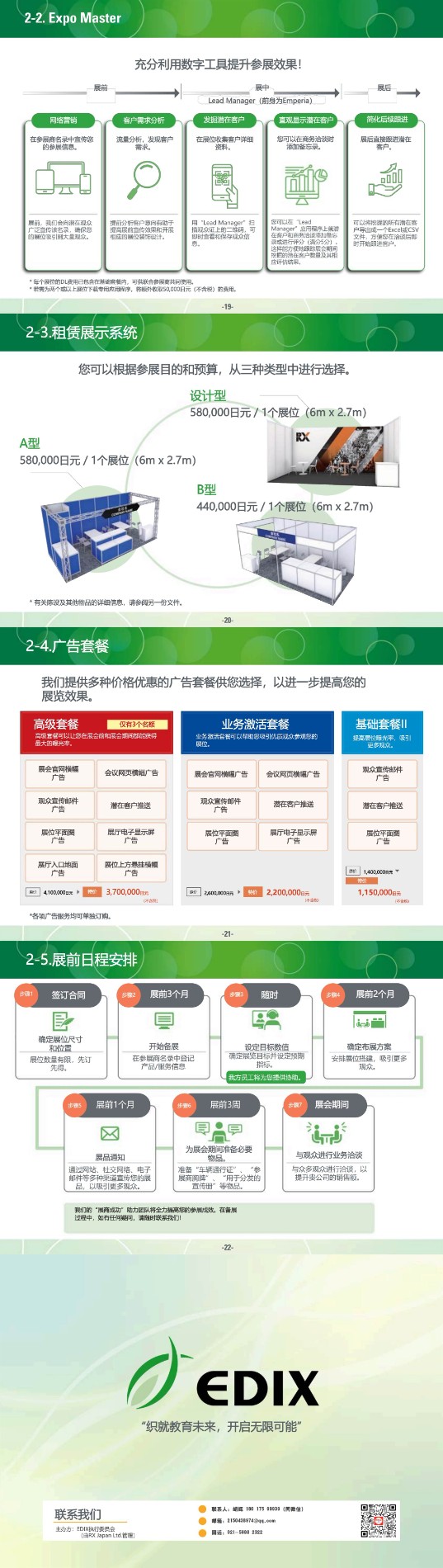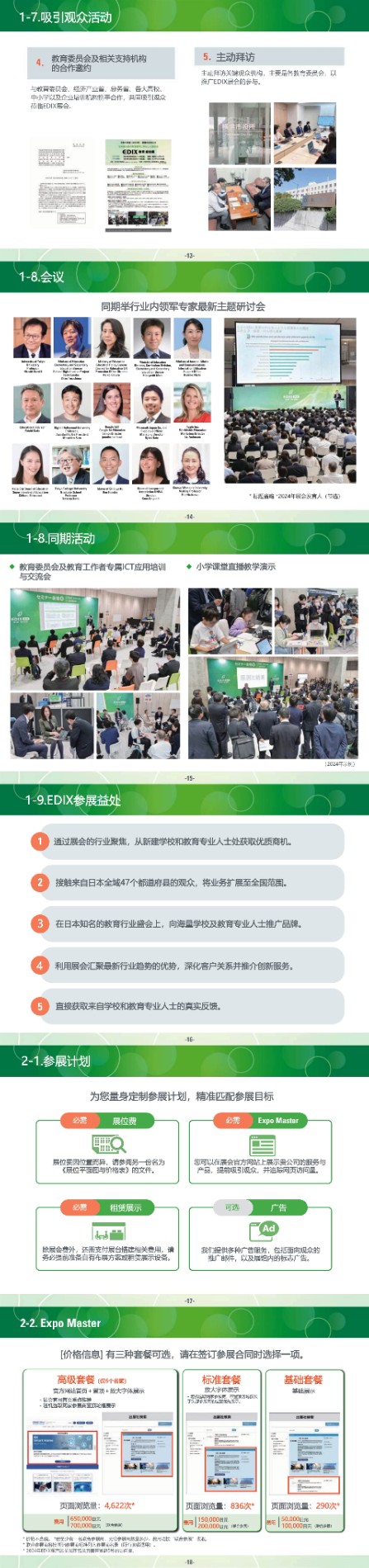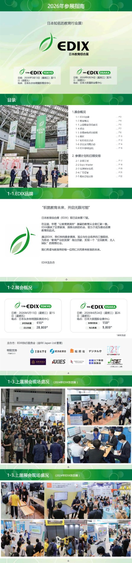 日本东京教育装备展览会(EDIX)日本教育技术行业領先规模的展会。汇聚了頂尖的 ICT 服务提供商、硬件制造商、 内容提供商、电子学习、数字教材、编程等,聚集希望拓展在日本教育领域市场业务的产品和服务提供 商,是进入日本教育市场的絶佳途径。同期举办教学及 IT 解决方案展、学校设施和服务展览会和 STEM 教育展览会等 3 个子展会,吸引日本许多学校官员到访 EDIX 展会。让您与产品的使用者学校管理人员、教师等近距离接触,是亚洲領先的教育技术行业贸易展之一。
