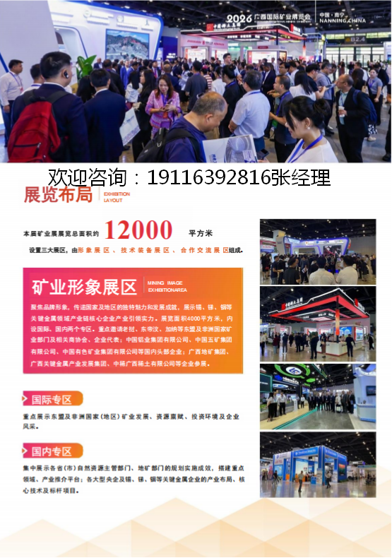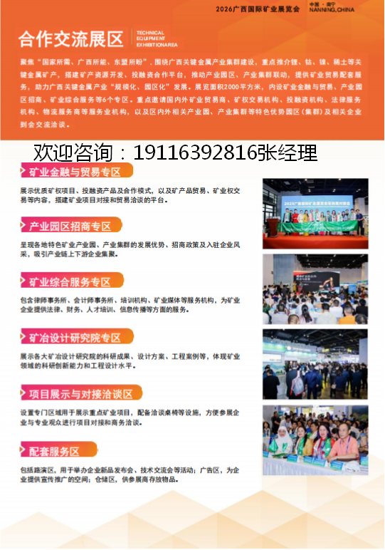 3.合作交流展区:聚焦“国家所需、广西所能、东盟所盼”,围绕广西关键金属产业集群建设,重点推介锂、钴、镍、稀土等关键金属矿产,搭建矿产资源开发、投融资合作平台,推动产业园区、产业集群联动,提供矿业贸易配套服务,助力广西关键金属产业“规模化、园区化”发展。展览面积2000平方米,内设矿业金融与贸易、产业园区招商、矿业综合服务等6个专区。重点邀请国内外矿业贸易商、矿权交易机构、投融资机构、法律服务机构、物流服务商等服务业机构,以及区内外相关产业园、产业集群等特色优势园区(集群)及相关企业到会交流洽谈。