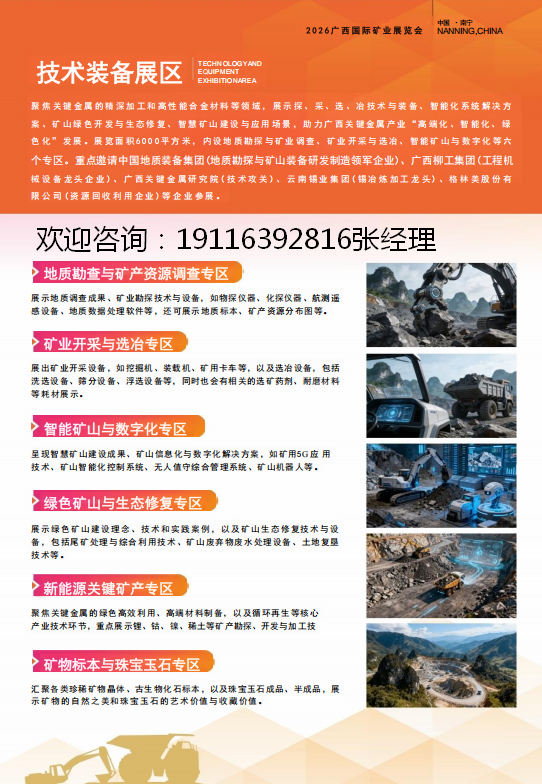 2.技术装备展区:聚焦关键金属的精深加工和高性能合金材料等领域,展示探、采、选、冶技术与装备、智能化系统解决方案、矿山绿色开发与生态修复、智慧矿山建设与应用场景,助力广西关键金属产业“高端化、智能化、绿色化”发展。展览面积6000平方米,内设地质勘探与矿业调查、矿业开采与选冶、智能矿山与数字化等六个专区。重点邀请中国地质装备集团(地质勘探与矿山装备研发制造领军企业)、广西柳工集团(工程机械设备龙头企业)、广西关键金属研究院(技术攻关)、云南锡业集团(锡冶炼加工龙头)、格林美股份有限公司(资源回收利用企业)等企业参展。